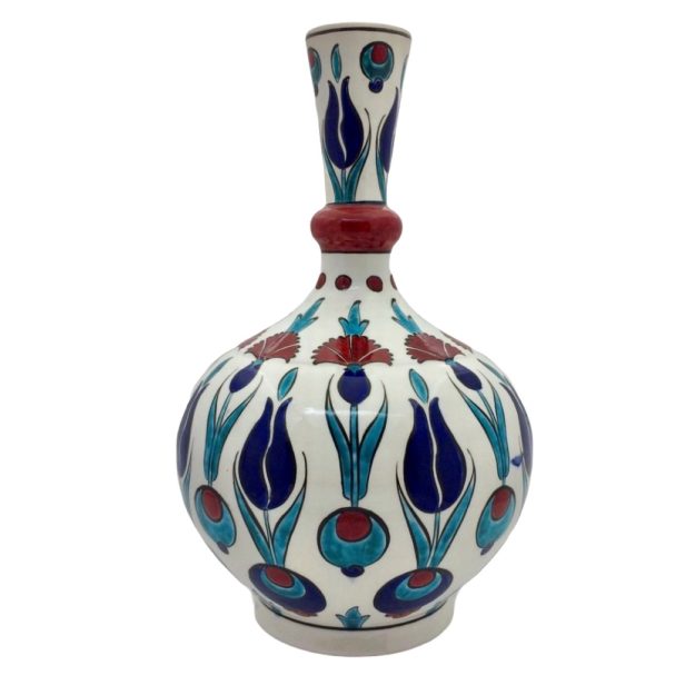 Geleneksel Türk çini sanatının zarif motifleriyle süslenmiş bu el yapımı çini vazo, evinizin dekorasyonuna estetik ve kültürel bir dokunuş katıyor. 15×20 cm ölçülerindeki zarif formu sayesinde masa, raf ya da vitrinlerde şık bir şekilde sergilenebilir. Parlak sır kaplaması, desenlerin canlılığını korurken uzun ömürlü kullanım sağlar.
